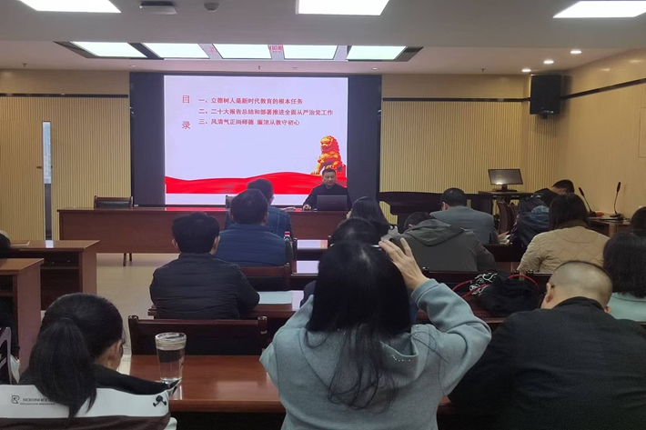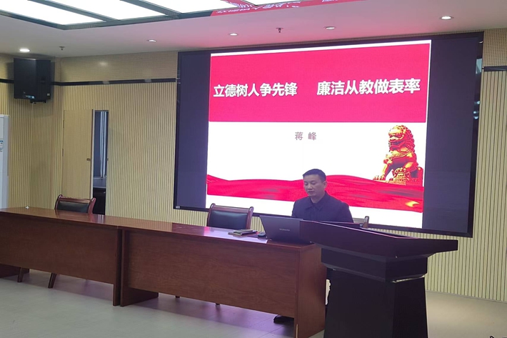 蒋峰以《立德树人当先锋,廉洁从教做表率》为题,从立德树人、全面从严治党、廉洁从教等三个部分进行了专题授课。第一部分,他从立德树人是新时代教育的根本任务到师德师风是评价教师素质的第一标准,深刻阐述了每个教育工作者的责任。第二部分,他指出党风廉政警示教育常抓不懈,全面从严治党永远在路上。第三部分,他倡导全体教职工要筑牢政治忠诚,坚持把党的政治纪律和政治规矩摆在首要位置,坚持立德树人,营造风清气正的育人环境。