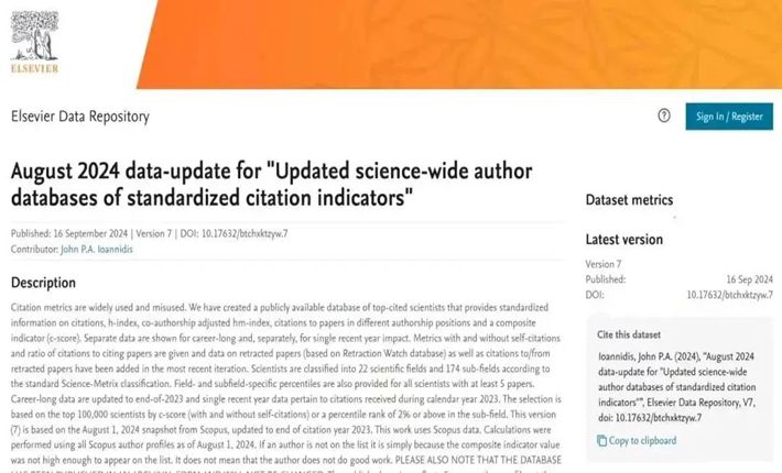 该榜单是斯坦福大学John P. A. Ioannidis教授团队与Elsevier与合作的项目成果,由爱思唯尔出版社发布在Elsevier旗下的Mendeley Data网站上。榜单基于Scopus数据库的引用数据系统分析,以被引数(区分自引和他引,提供自引数据)、H指数、HM因子等6种综合指标 (composite score,C-score),根据 “生涯影响力”和“年度影响力”从近700万名科学家中遴选出世界排名前2%的科学家,分为22个领域和176个细分子领域。榜单提供了面向科学家长期科研表现的衡量指标,客观真实反映科学家的学术影响力。据悉,我校有15位科学家入选。