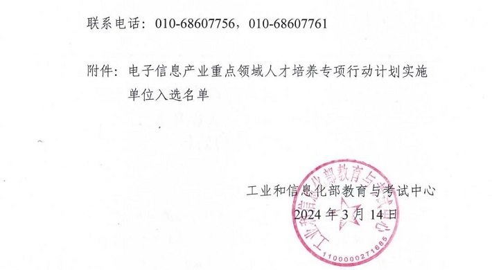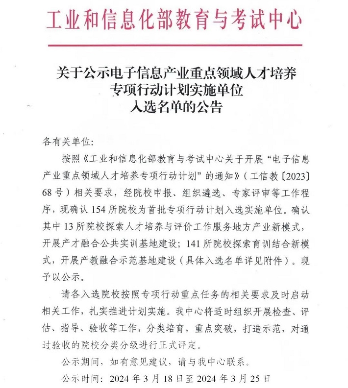 近日,国家工业和信息化部教育与考试中心公布了“电子信息产业重点领域人才培养专项行动计划”实施单位入选名单,以电子信息与物理学院牵头申报的电子信息产教融合项目成功获批,成为全国154所院校首批专项行动计划入选实施单位之一。